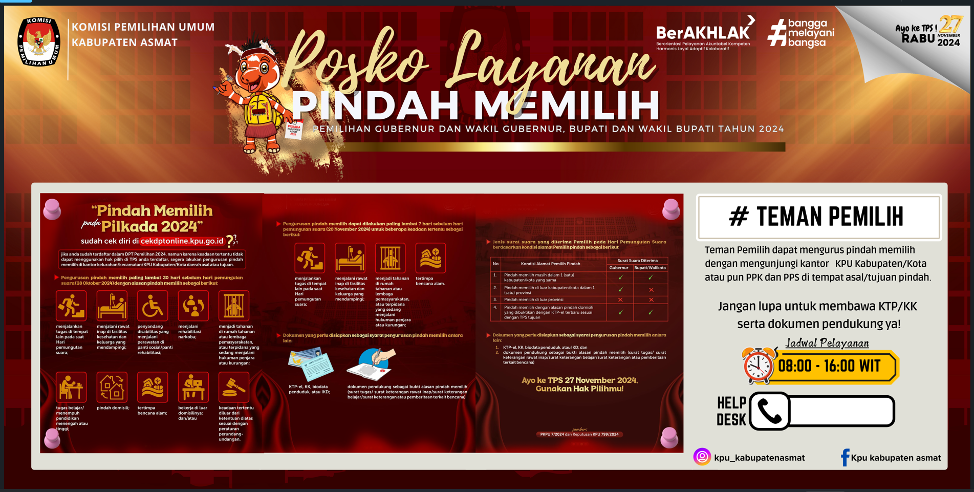 Untuk itu Bagi Teman Memilih segera datangi PPS/PPK/KPU Kab/Kota Asal maupun Tujuan untuk mengurus Dokumen Model A - Surat Pindah Memilih, Help Desk KPU Kabupaten Asmat Siap Melayani dengan Sepenuh Hati.