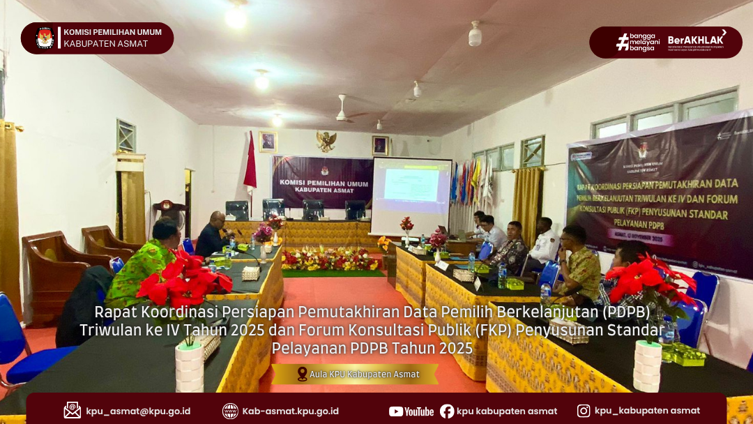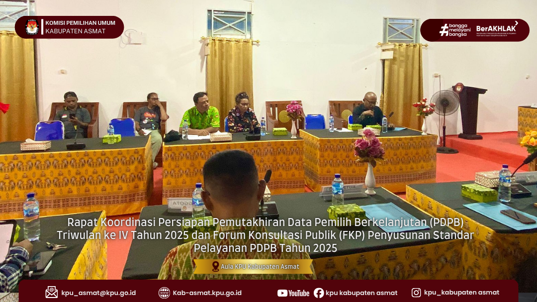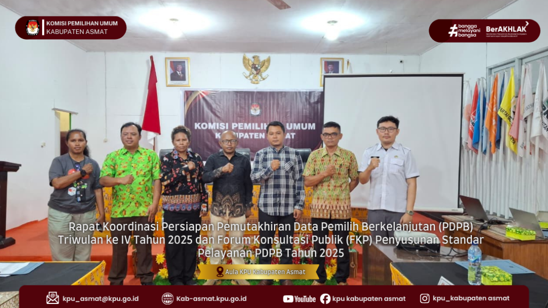 Agats, 13 November 2025 – Komisi Pemilihan Umum (KPU) Kabupaten Asmat melaksanakan Rapat Koordinasi Pemutakhiran Data Pemilih Berkelanjutan (PDPB) Triwulan IV yang dirangkaikan dengan Forum Konsultasi Publik (FKP) Penyusunan Standar Pelayanan PDPB bertempat di Aula KPU Kabupaten Asmat. Kegiatan ini dihadiri oleh unsur Bawaslu Kabupaten Asmat, Dinas Dukcapil, Badan Pusat Statistik (BPS), dan Kesbangpol Kabupaten Asmat.