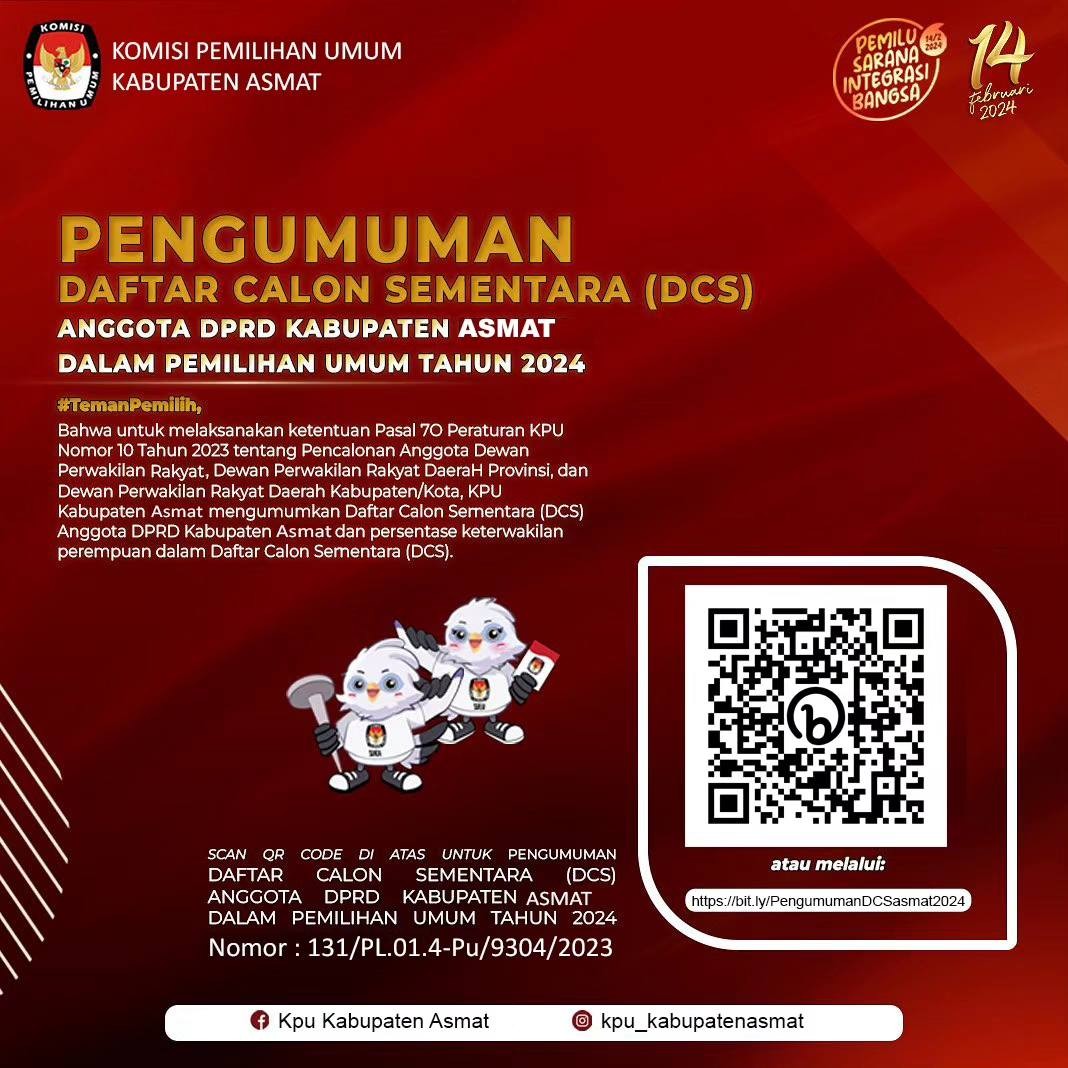 #TemanPemilih, Komisi Pemilihan Umum Kabupaten Asmat telah menetapkan Daftar Calon Sementara (DCS) Anggota DPRD Kabupaten Asmat Pada Pemilu Tahun 2024 dalam Pengumuman Nomor : 131/PL.01.4-Pu/9304/2023.